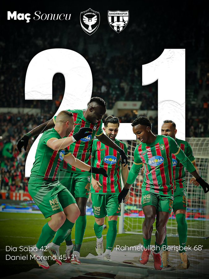 Taraftar desteğini de alan Amedspor, maça hızlı başladı. Amedspor maçın ilk yarısını Dia Saba ve Moreno’nun attığı gollerle 2-0 önde kapattı.