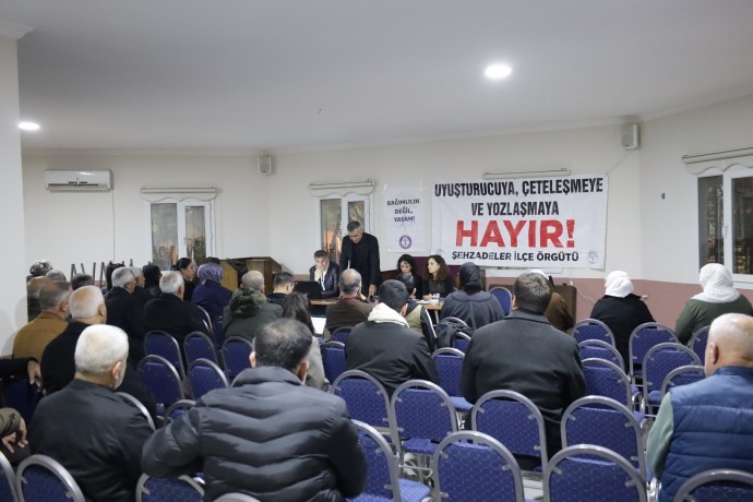 İzmir Bağımlılıkla Mücadele Platformu, Manisa’nın Şehzadeler ilçesinde bir taziye evinde “Bağımlılık değil yaşam” başlıklı bir panel düzenledi. Panelin moderatörlüğünü Halkların Eşitlik ve Demokrasi Partisi (DEM Parti) Manisa İl Yöneticisi Avukat İsmail Terut üstlenirken, konuşmacılar arasında Psikolog ve platform üyesi Hülya Tulgar, platform üyeleri Dilan Toprak ile Erhan Morkoç yer aldı.