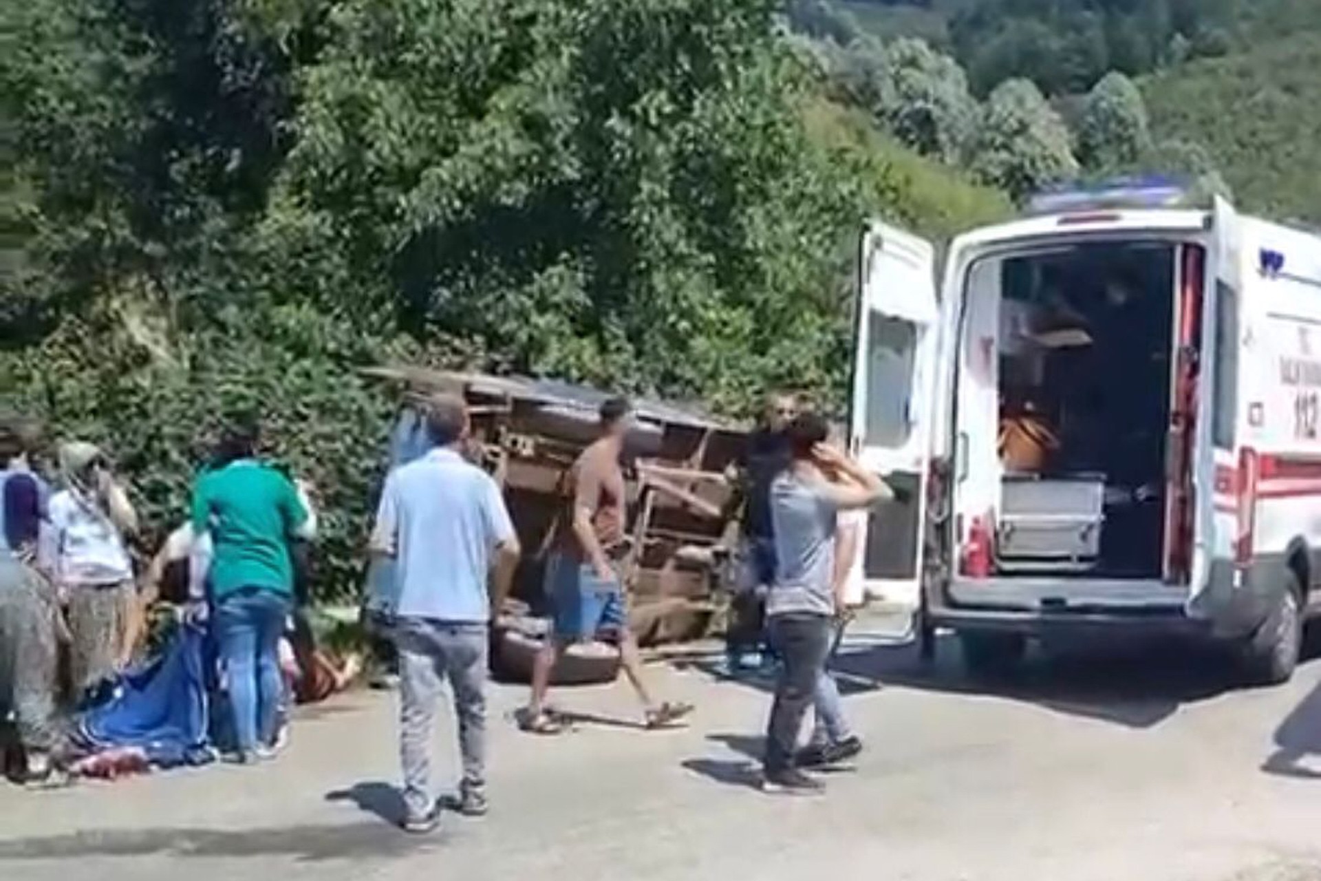 Düzce — Düzce’de, fındık işçilerinin taşındığı römorkun devrilmesi sonucu 7 işçi yola savrularak yaralandı.