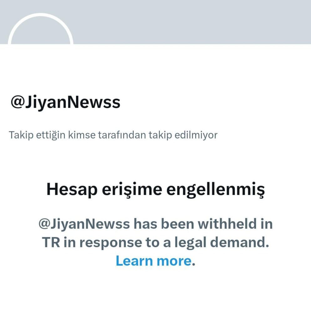 Jiyan News’in X (Twitter) hesaplarına Bilgi ve İletişim Teknolojileri Kurumu’nun talebi üzerine erişim engeli getirildi.