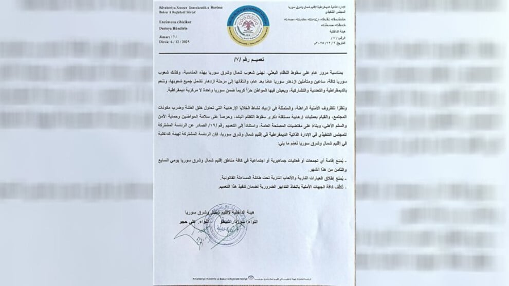 Kuzey ve Doğu Suriye Demokratik Özerk Yönetimi İçişleri Komitesi, Baas rejiminin çöküşü olan 7-8 Aralık’ta olası DAIŞ saldırılarına karşı her türlü toplu kutlama, eylem etkinliğin yasaklandığını duyurdu.