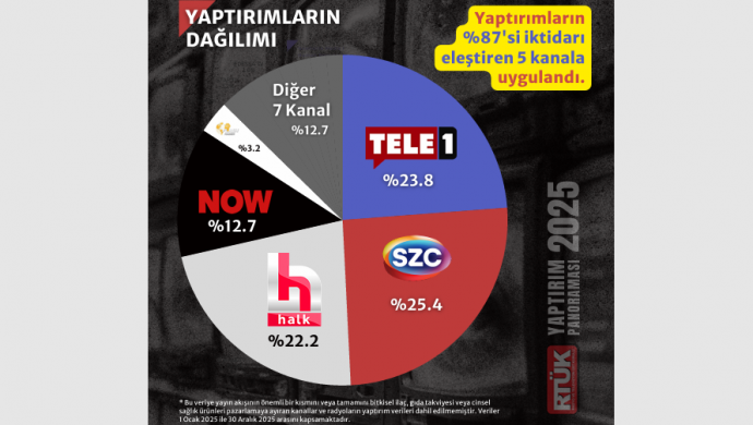 İpekyüz’ün hazırladığı yaptırım dosyasına göre, RTÜK’ün yıl boyunca verdiği cezaların yüzde 87’si AKP’yi eleştiren televizyon kanallarına uygulandı. Dosyada, bu kanalların iktidara yakın yayın yapan kanallara kıyasla yaklaşık 7 kat daha fazla yaptırıma maruz kaldığı tespiti yer aldı.